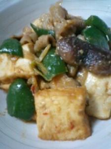 肉の色が変わってきたら、シイタケ、たけのこを加えて炒め合わせ、全体に油がまわったら厚揚げとピーマンを加えます。