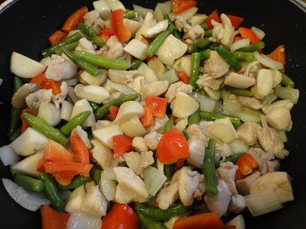 鶏肉、パプリカ、玉ねぎ、エリンギは小さ目にカット。インゲンは解凍し半分にカット。