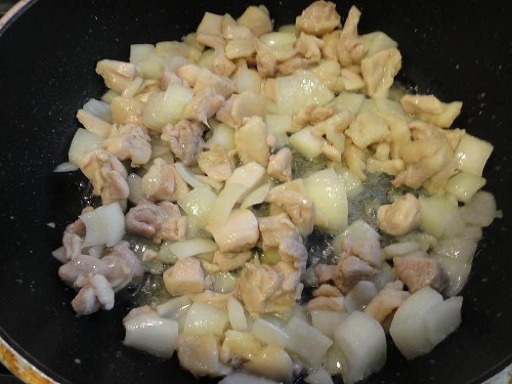 ![]() フライパンにごま油を熱し、ニンニク、鶏肉、玉ねぎの順に炒め塩・胡椒をする。