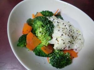 ブロッコリーは、塩茹でして、冷水でさまします。ニンジンは、サッと熱湯に通してこれも冷水にとります。
