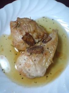 裏返して、しばらく焼いてから、白ワインを注ぎ鍋底の肉の焦げ付きをこそげ取りながら、火を強めて、アルコール分を飛ばします。