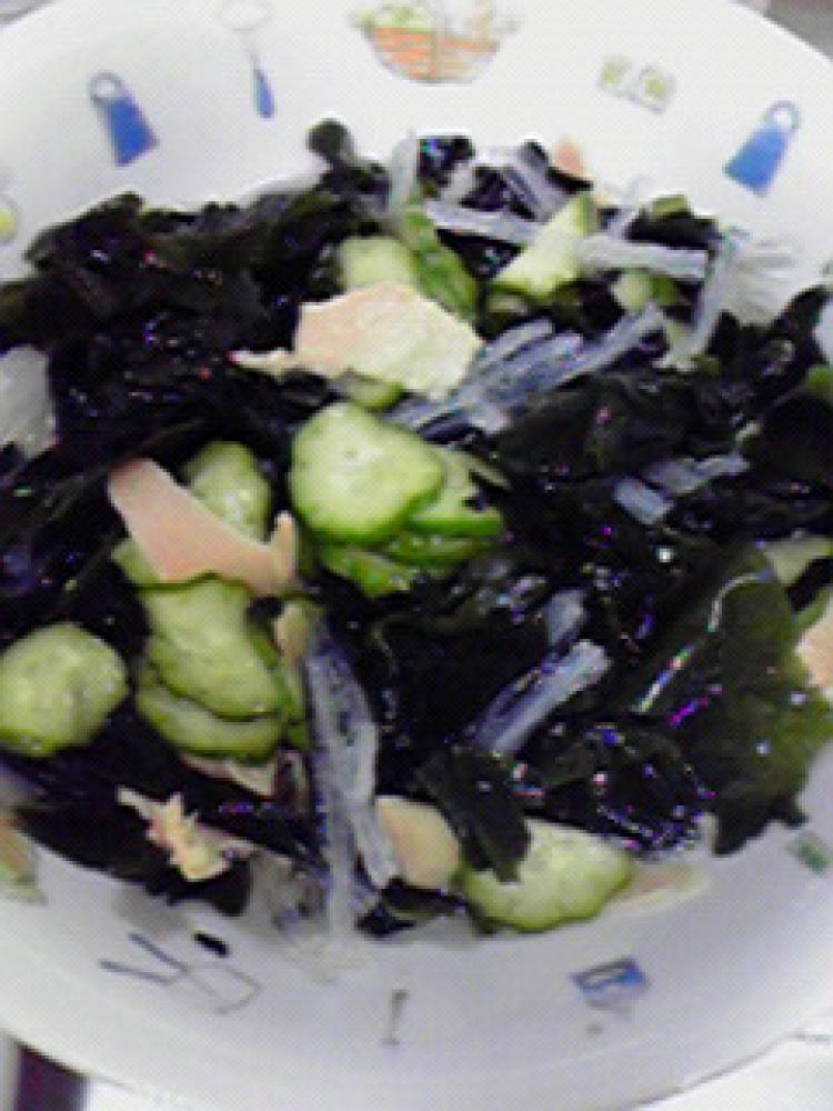 5分ほどおき、わかめと糸寒天も入れて和えます。 |