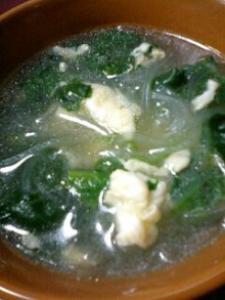 鍋にスープを煮立て、酒、塩コショウで味を決め、ホウレン草、はるさめを入れて、ひと煮立ちさせ、溶き卵を静かに流し入れます。