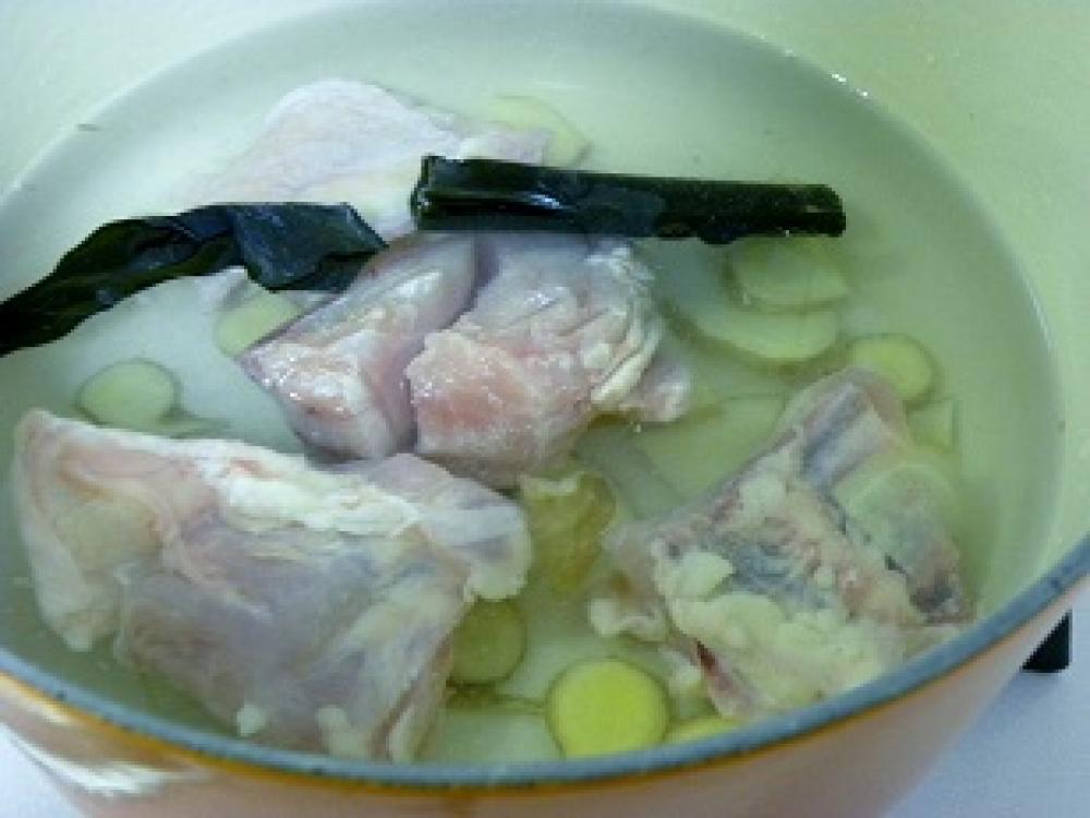 ![]() 鶏肉は食べやすい大きさにする。よく洗って皮ごとスライスした土生姜やこんぶと共に、土鍋などで水からゆでる。