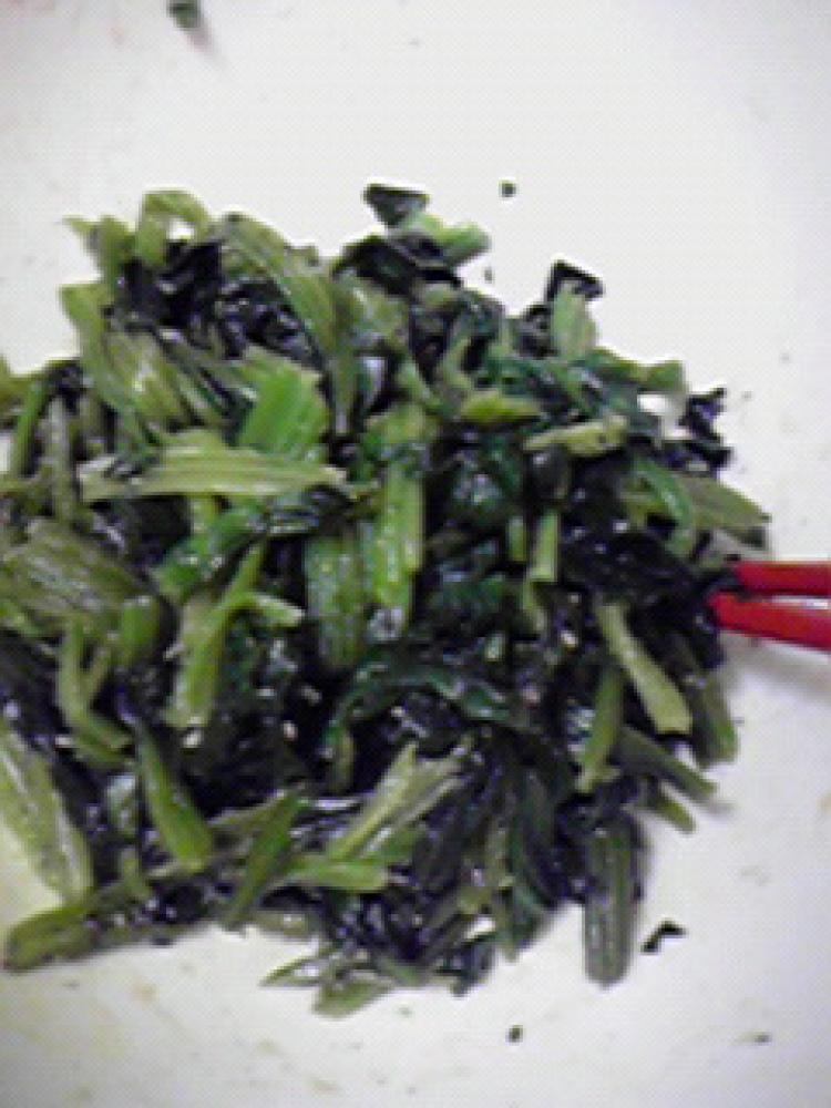 ラップで包み、レンジで3分加熱します。 冷水にとり、あくを抜きます。 |