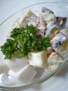 器に1を入れ、パプリカパウダーを振りかけ、カットしたはんぺんを横に盛り付けます。彩りにパセリを乗せて、出来上がりです。