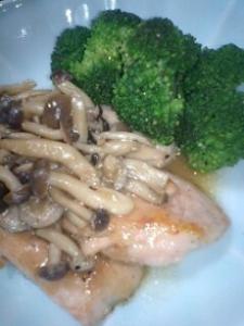 2にきのこソースをかけ、ブロッコリーを添えてお召し上がりください。