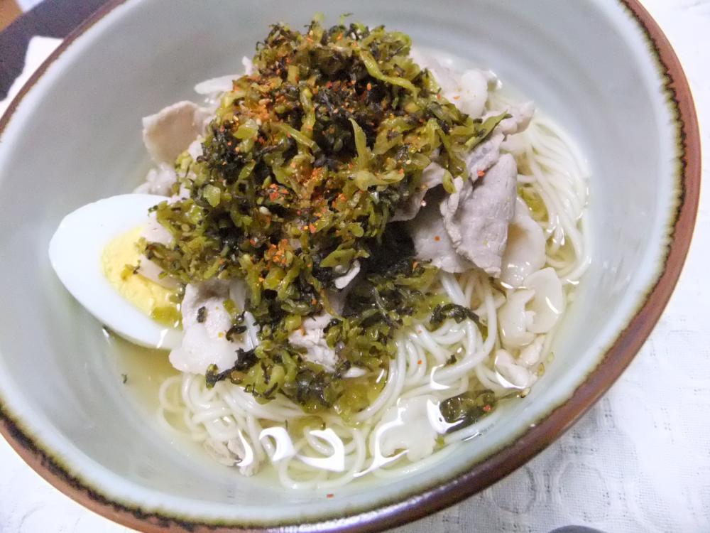 器に麺を盛り、つゆを豚肉ごと注ぐ。高菜と半分に切ったゆで卵を乗せ、七味唐辛子をかける。