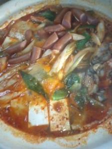 肉の色が変わったら、キムチ、ネギ、白菜、モヤシ、豆腐を入れます。