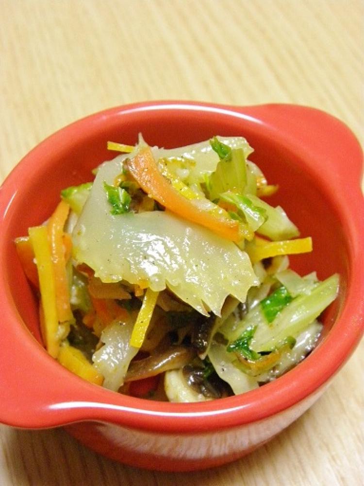 セロリに透明感が出たら塩麹を入れて、ひと混ぜして火を止め、七味を好みの分量入れて出来上がり。