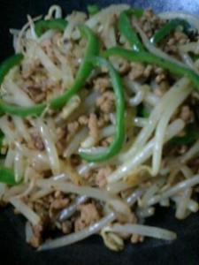 肉の色が変わったらカレー粉を振って混ぜモヤシ、ピーマンを加えて、手早く炒め、塩、ブラックペッパーで調味します。
