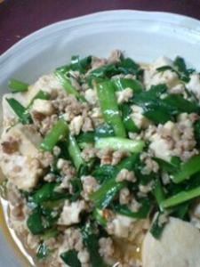 肉がほぐれてきたら、調味量を加えて煮立て、豆腐も加えて、時々返しながら煮込みます。