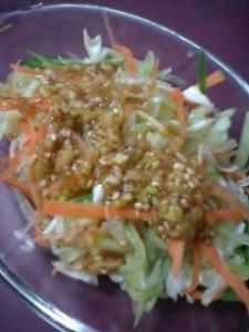ドレッシングの調味量をよく混ぜ合わせて作ります。千切りにした野菜を器に入れ、これを回しかけてください。