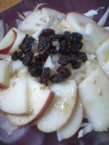 白菜、リンゴにレーズンを加えて、器に盛ります。