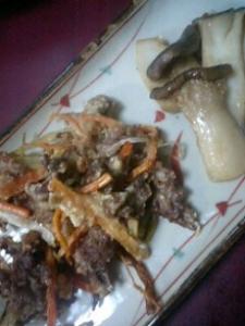 牛肉は、1口サイズに切り、下味をつけます。ネギは、3cm長さの千切りにし、ニンジンも同じ長さの千切りにします。