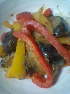 ナスは、へたを取り、縦半分に切り、乱切りにします。パプリカは、へたと種を除いて、細めの乱切りにします。
