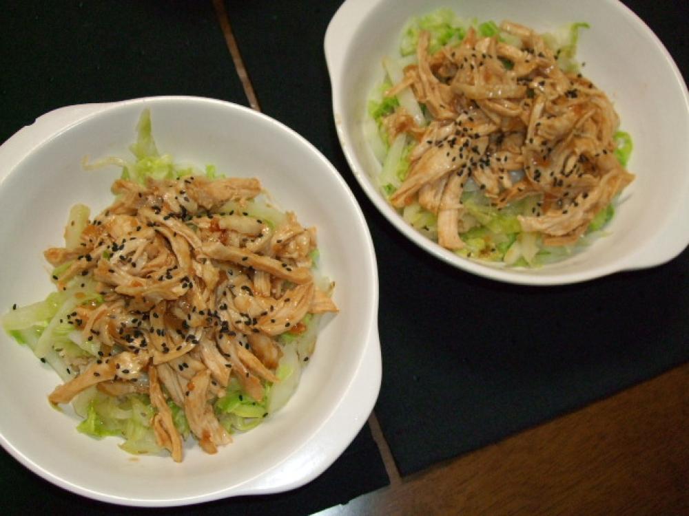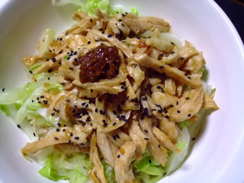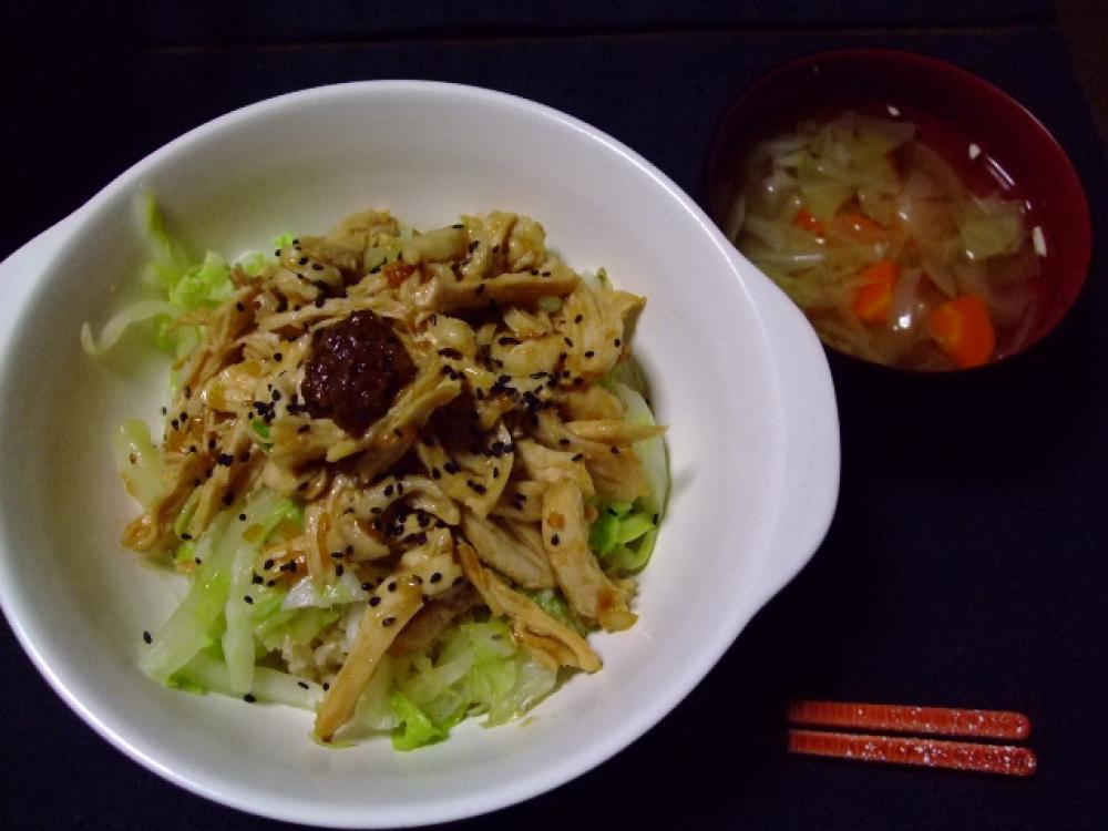 ![]() ご飯に白菜を敷き、ムネ肉をこんもりたっぷりと乗せ、黒胡麻を掛け残りの味噌ダレを乗せて出来上がりです。