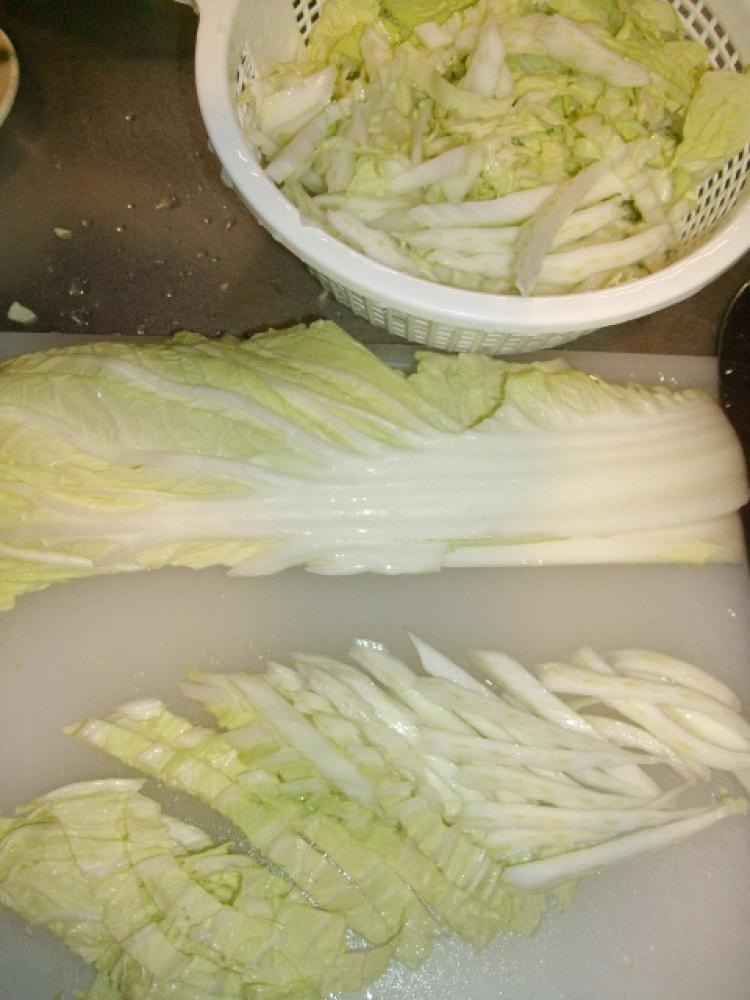 ![]() 白菜は、洗い縦半分に切ってから斜め切りにし、水切りします