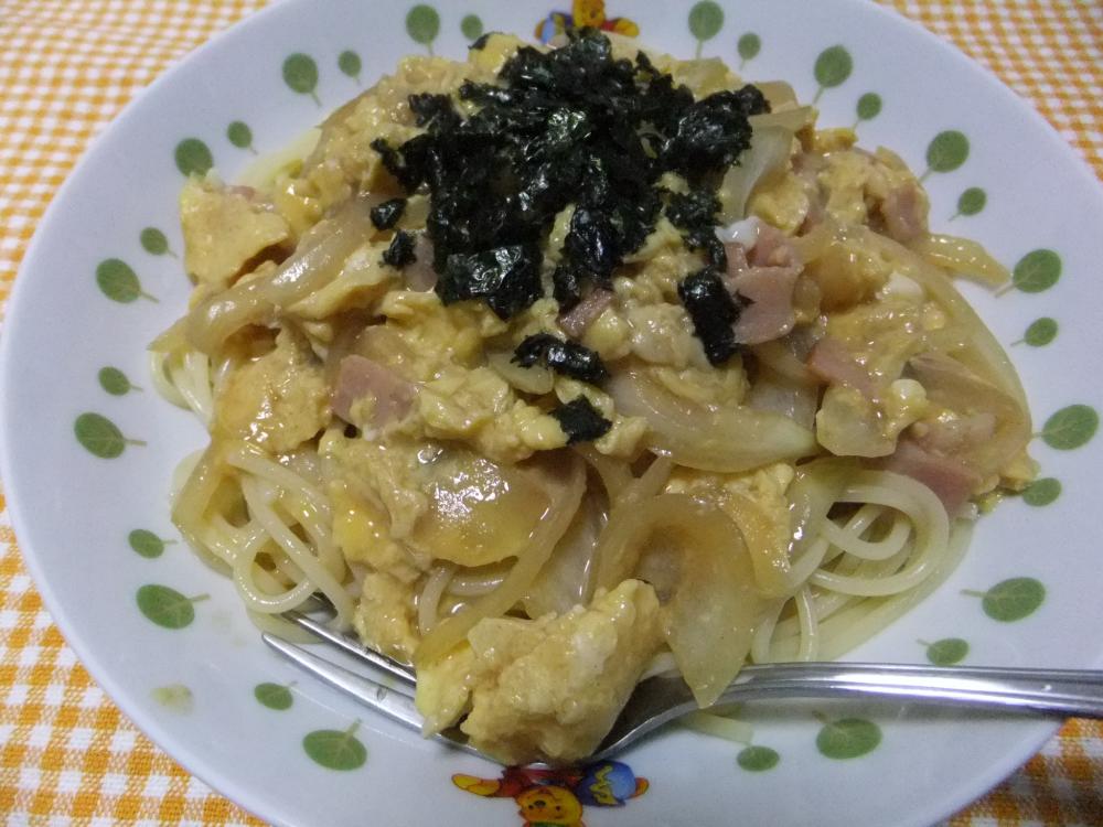 溶き卵を回し入れて蓋をし、弱火で1分加熱する。火を切って蓋をしたまま1-2分蒸らす。