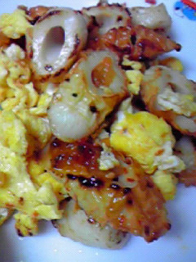 焼き色がついたら、合わせ調味料を回しかけます。 卵を戻し入れ、全体を混ぜて出来上がり。 |