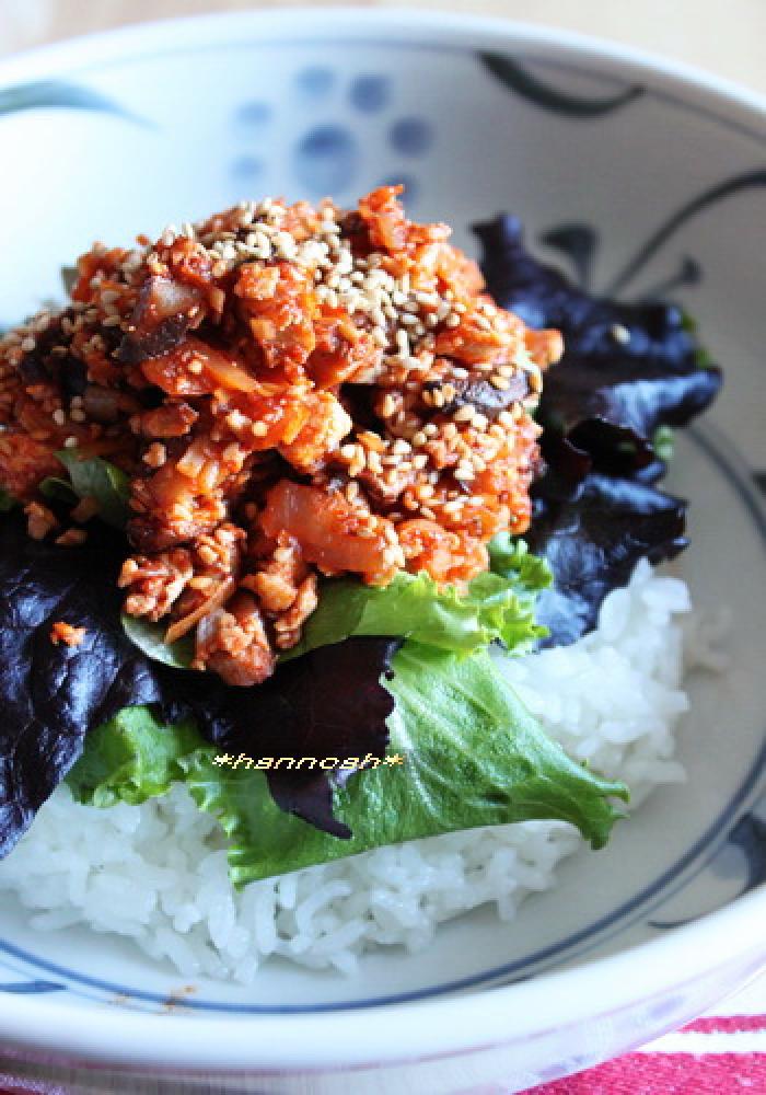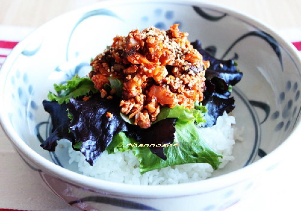 ![]() 器にご飯をよそい、手でちぎったサニーレタスをのせて、そぼろを盛り付けしていただきます。