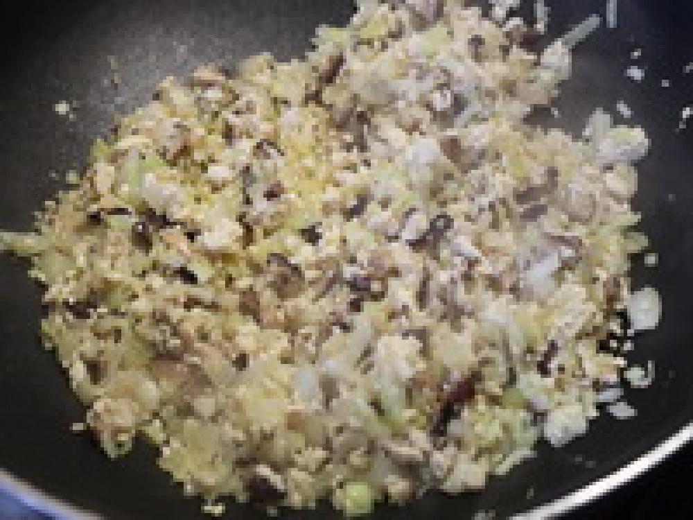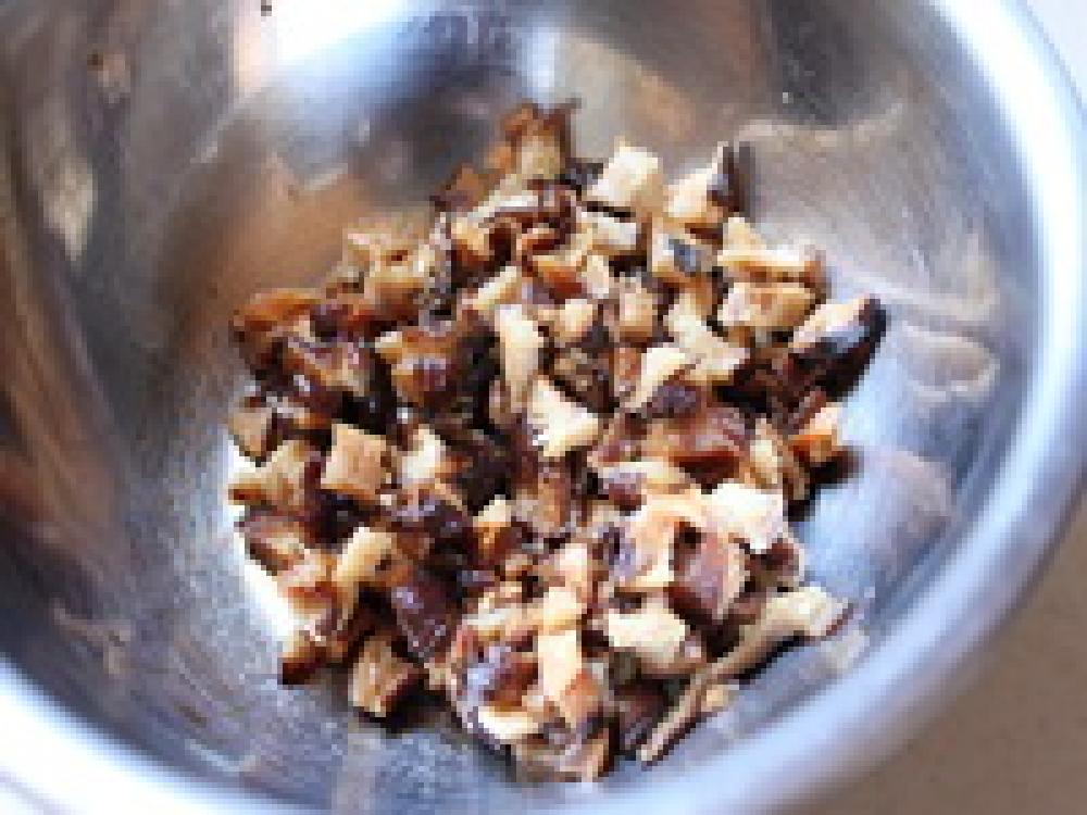 ![]() 干し椎茸は、水で戻しみじん切りにして、●の調味料であえておきます。