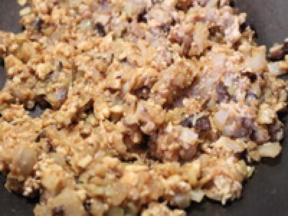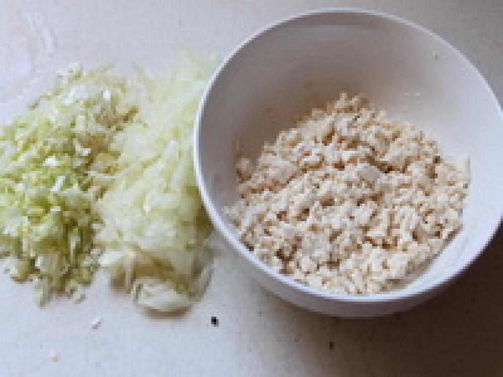 ![]() 葱、玉葱はみじん切りにします。豆腐はレンジに2分かけ(1000W)、水気をしっかり切って、細かくします。