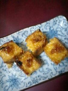 焼いた厚揚げに、たっぷりみそソースを乗せてもう1度オーブントースターで、焼き色がつくまで焼いて、出来上がりです。