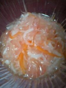 置いておいた大根、ニンジンの水気をギュッと絞り、合わせた果汁に入れて和え、残しておいたグレープフルーツをほぐし加えます。
