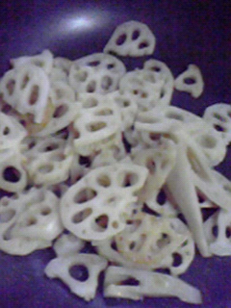 レンコンは皮をむき、縦半分に切って、薄切りにします。