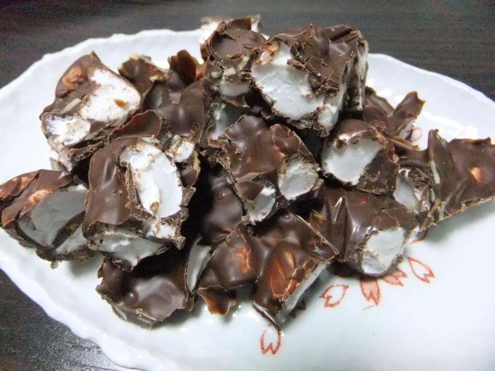 チョコレートの粗熱が取れたらアーモンドとマシュマロを入れてさっくり混ぜる。