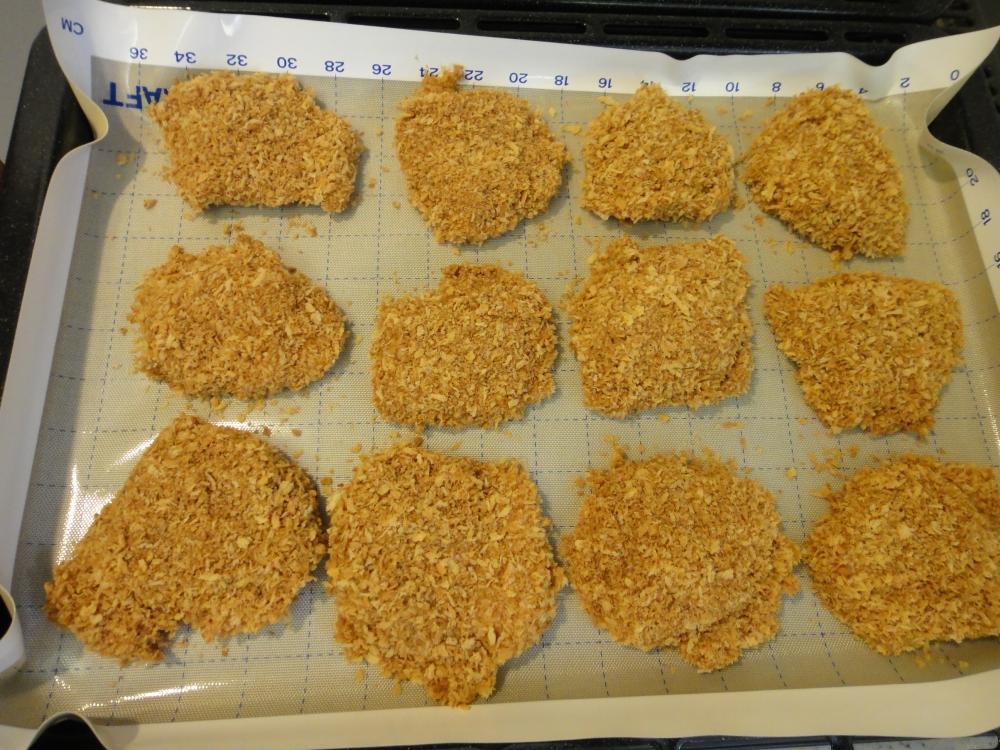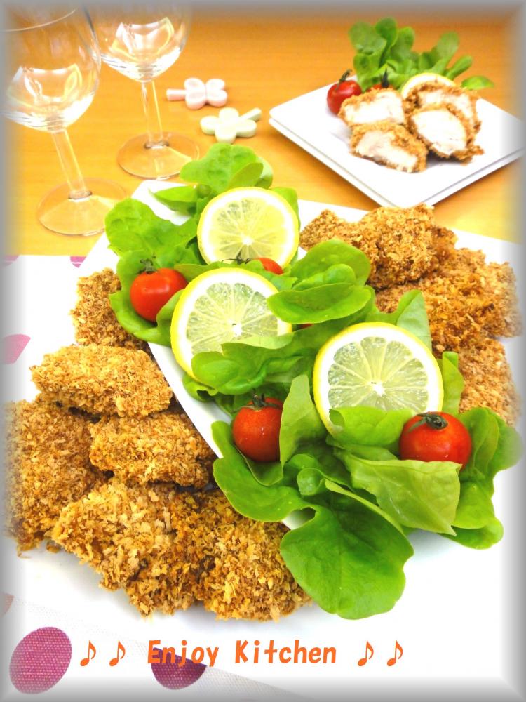 1の胸肉を入れ、しっかりと衣がつくように混ぜたら2のパン粉をつける。 |