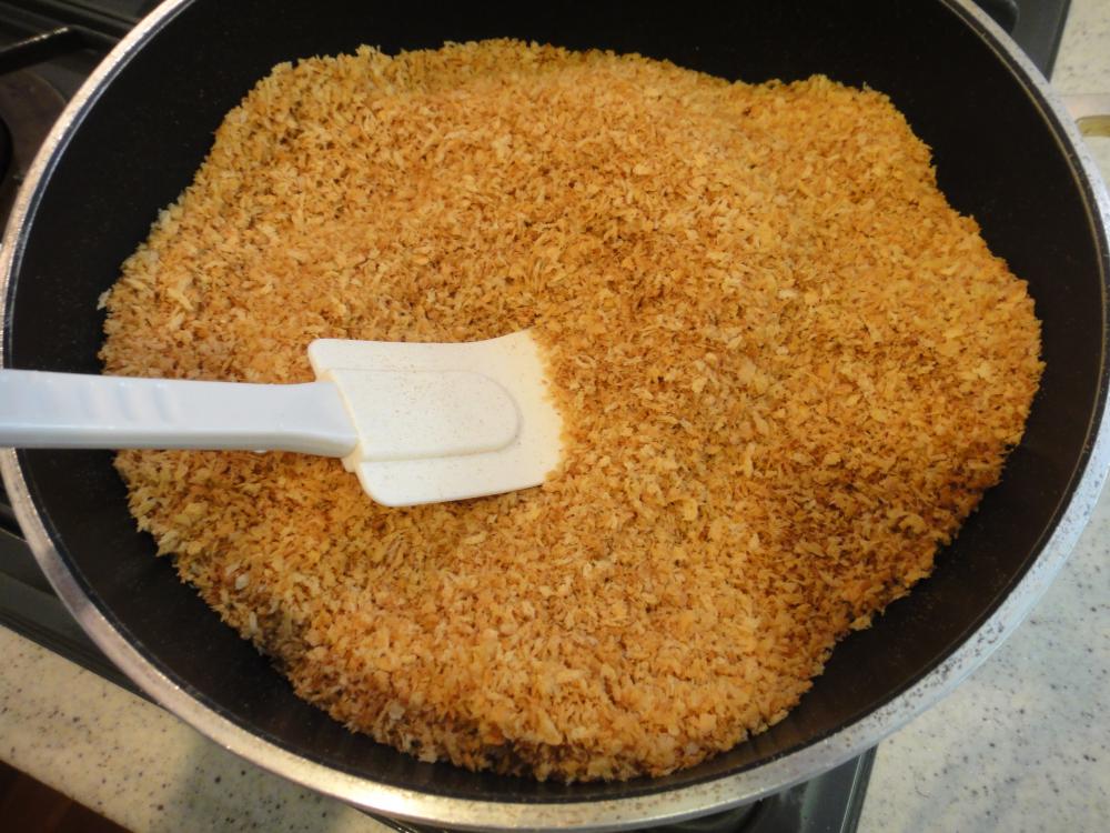 ![]() 中火のフライパンでパン粉をきつね色になるまでヘラで混ぜながら炒る。