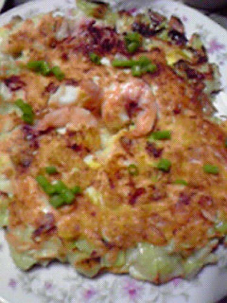 フライパンに油を敷き、中火にかけ、生地を流しいれます。 海老とゲソを並べて乗せます。 |