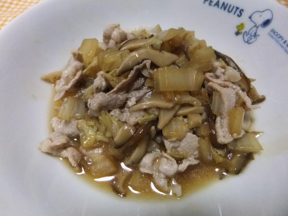 フライパンにごま油を熱し、白菜・しいたけ・おろししょうがを炒める。