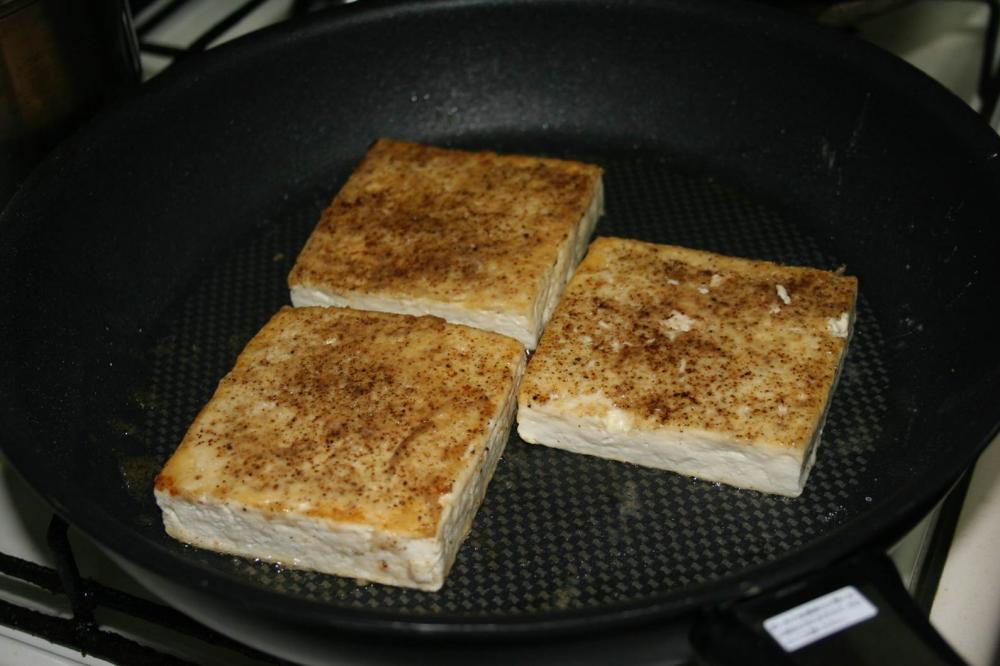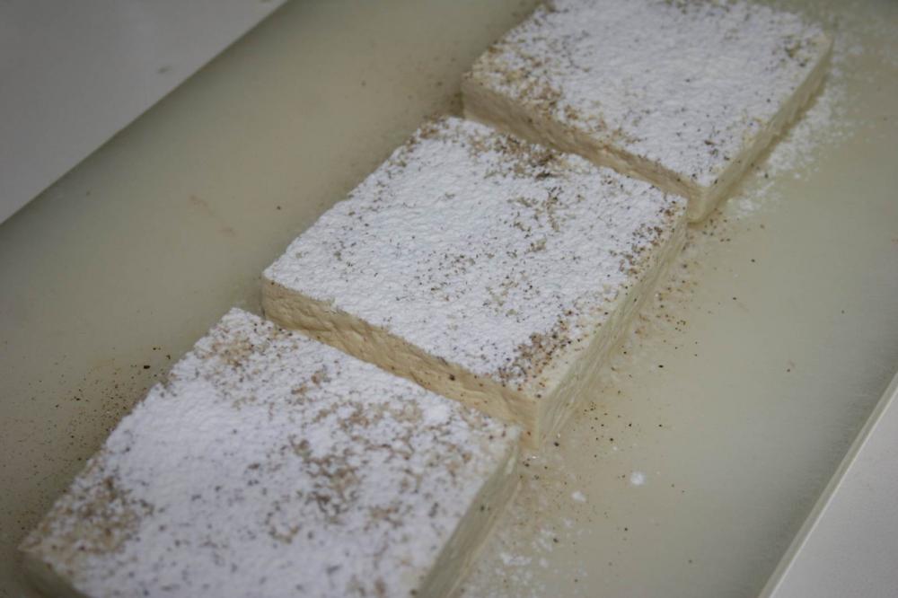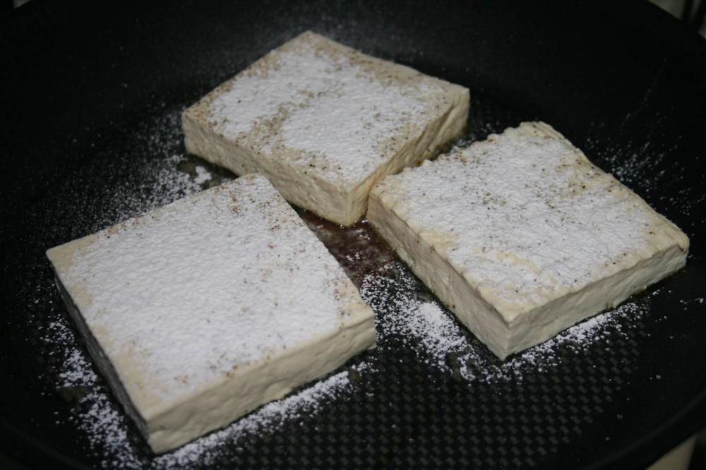 ![]() 木綿豆腐は3枚に切る. 片方の面に塩と胡椒を一振りずつかける. 小麦粉大さじ1を茶こしなどに入れて振りかける.