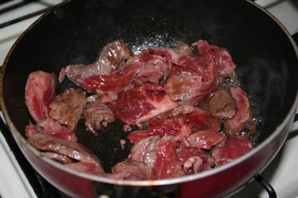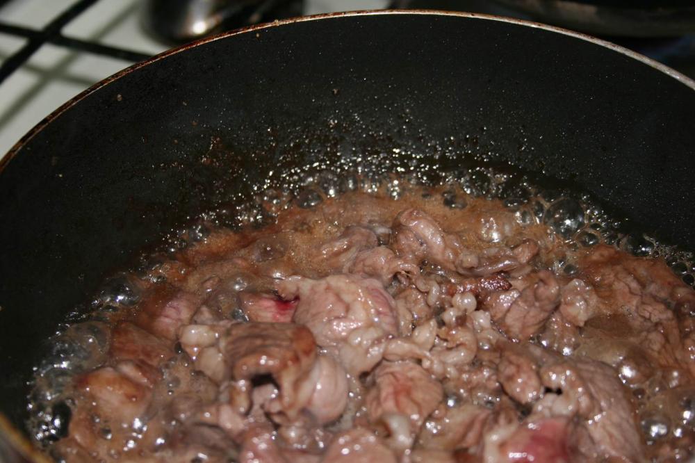 ![]() 弱火の鍋に牛肉を入れ、すぐにきび糖大さじ3を加え、混ぜる. しばらく加熱し続け、きび糖大さじ3を溶かす