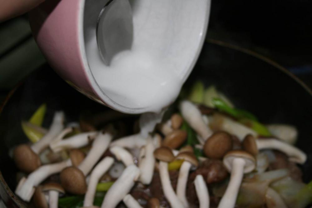 ![]() すき焼き風あんから作る. 牛肉200gは室温に戻す. 長ネギは幅1.5cmの斜め切りに. シメジは石突を取る.