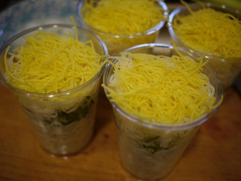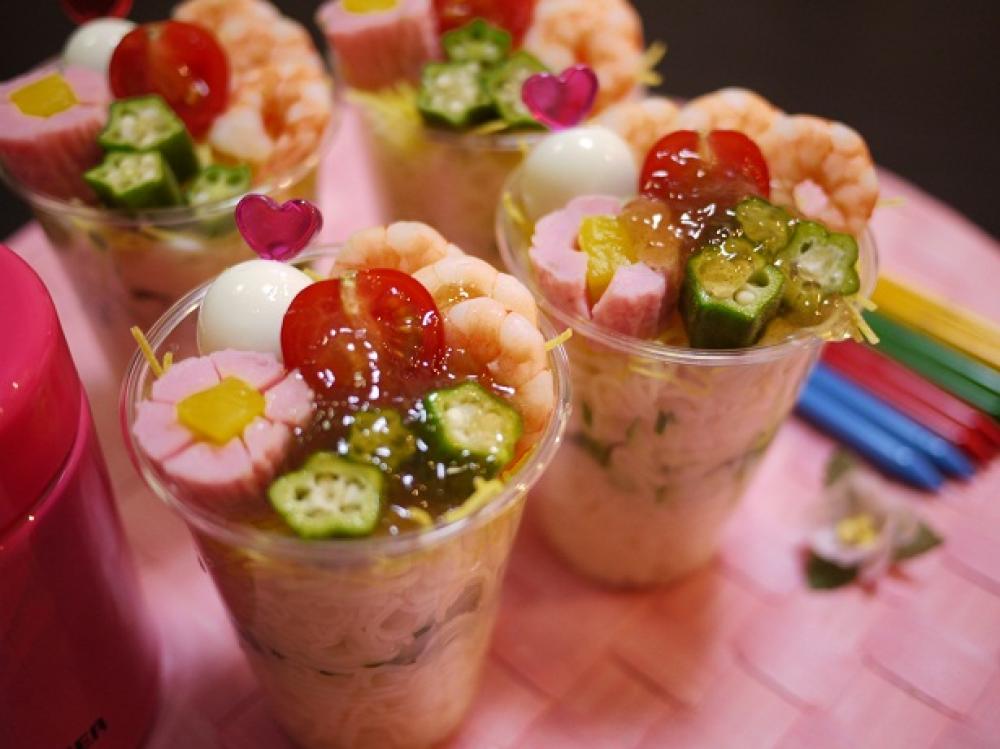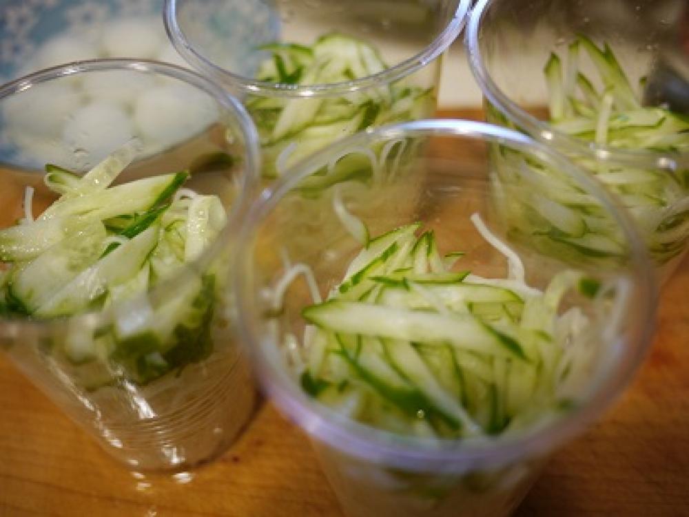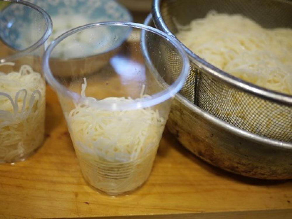 ![]() きゅりの千切りを入れ、そうめんを入れます。