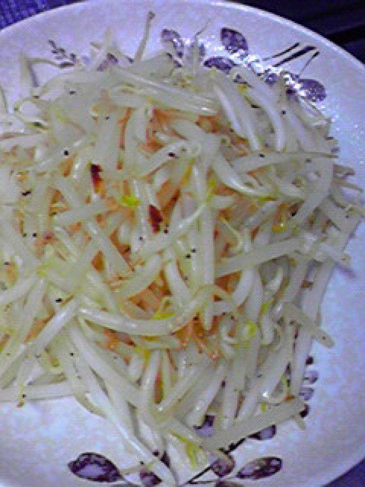 フライパンにオリーブオイルを熱し、もやしを炒めます。