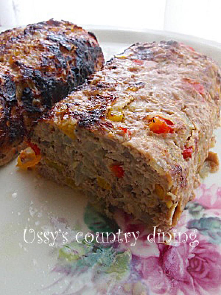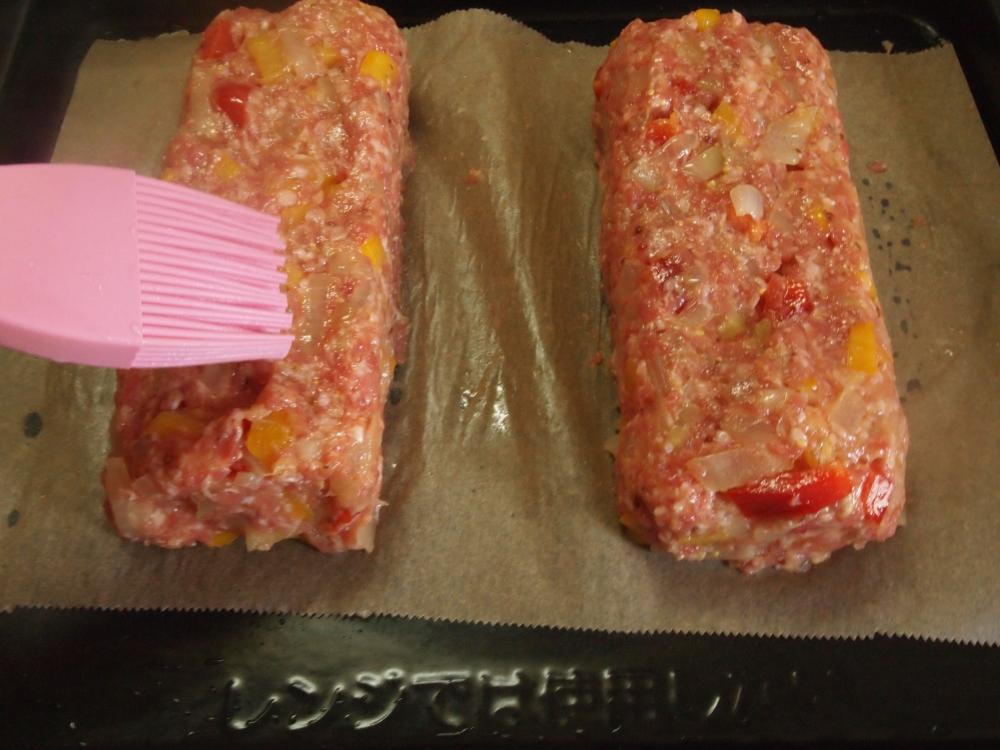 ![]() 天板にオーブンシートを敷き、ミートローフ生地を半分に分けて置き、なまこ型に整える。オリーブ油5gを塗る。