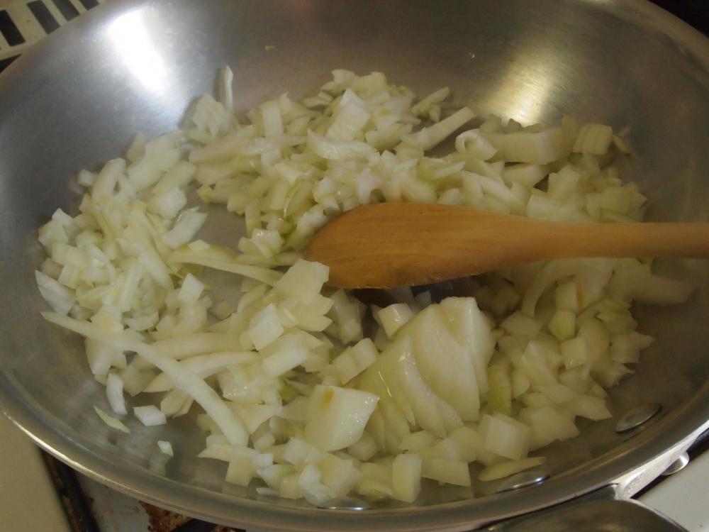 ![]() たまねぎをみじん切りにする。フライパンにオリーブ油5gとたまねぎを入れて弱火でしっかりと炒める。
