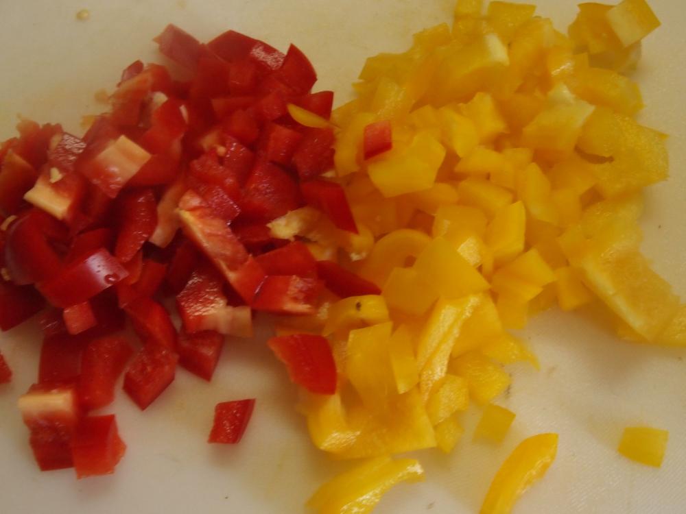 ![]() パプリカをあらめのみじん切りにする。しょうがをおろす。