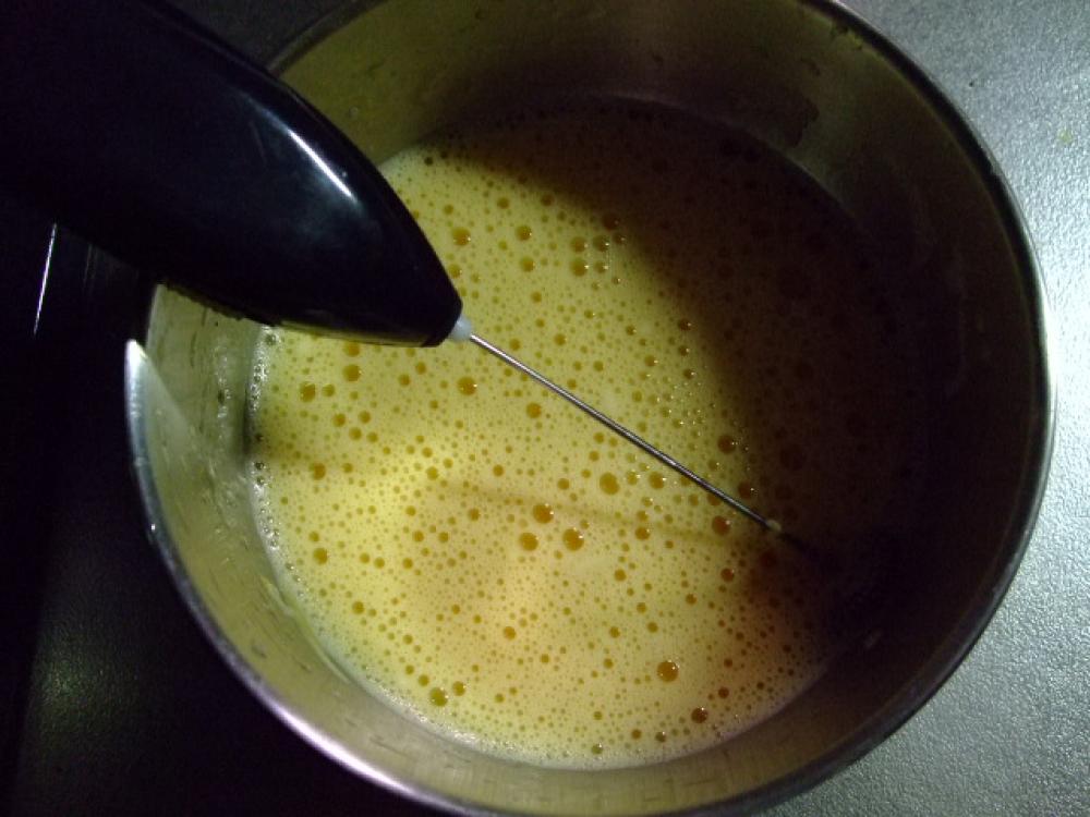 ![]() ボウルに卵を割りいれ、泡だて器でよく泡立たせます