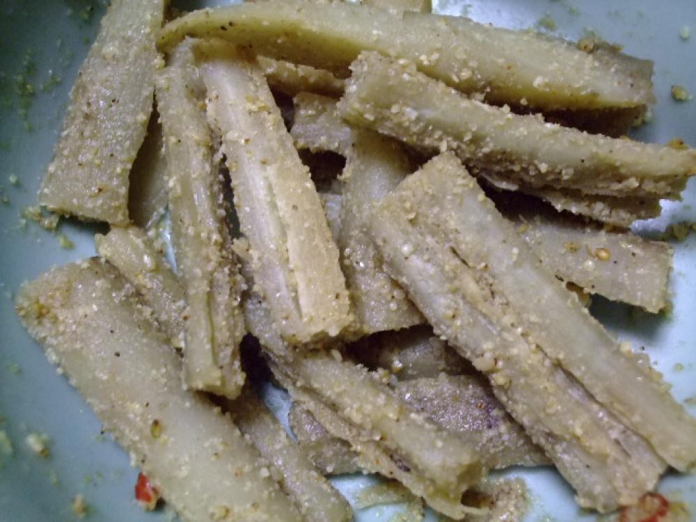 麺棒でたたき、幅5cmで切り軽く水にさらします |