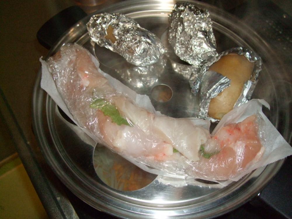 ![]() 蒸し器(ステン無水鍋)で中火→弱火で約5~6分蒸し、火を止めウォーターシールド(余熱)で15分程加熱します