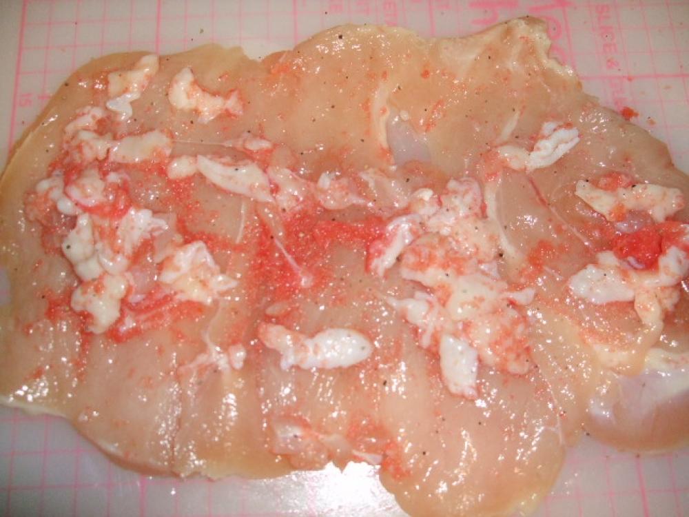 皮を1cm程に切り、明太子と混ぜ内側に塗り広げます |