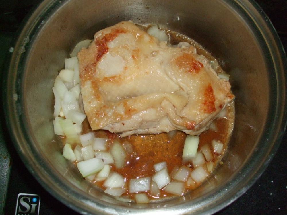 ![]() 深鍋を熱し、鶏肉を皮を下にして入れ焼きます