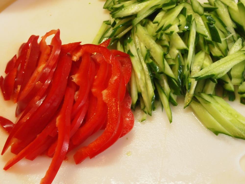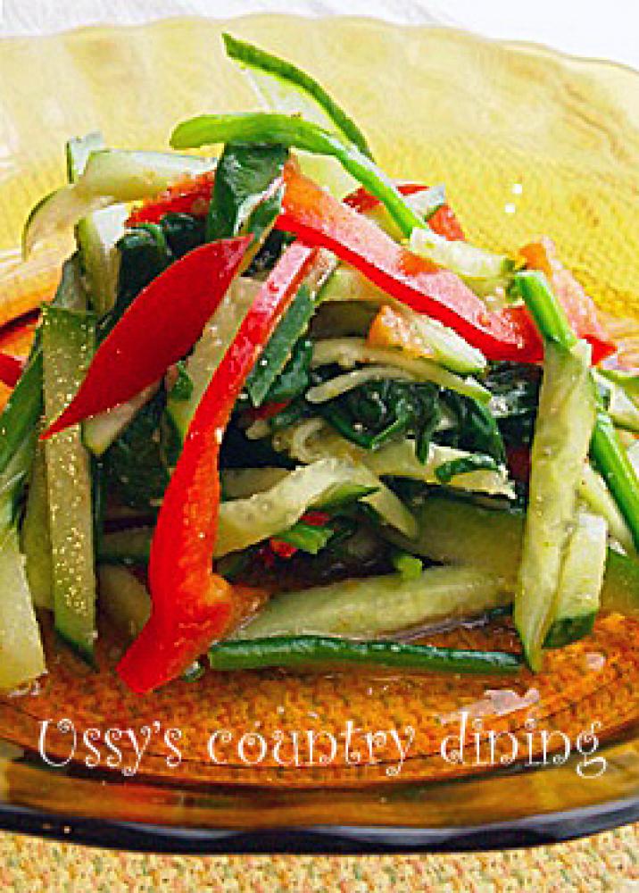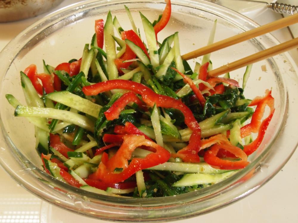 ![]() きゅうりとほうれん草、パプリカを加えてしっかりと混ぜたら出来上がり。ラップをしてしばらく冷蔵庫に置くと味がなじみます。