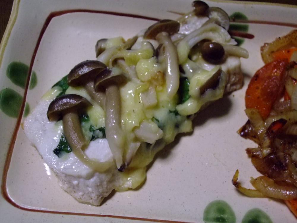 焼けたら裏返し大葉→シメジ→チーズの順で重ねます |